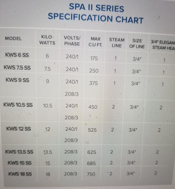 A. Most sizing charts are designed for pressurized steam generators. So, if you were told you need a 9KW in the pressurized brand, you might only need a 7.5KW in an open tank non-pressurized generator. Then, if you want to upsize to make it more intense then that is a personal preference. This will create a higher latent heat index and the duty cycles of steam will be shorter since more steam is filling up the room at once.